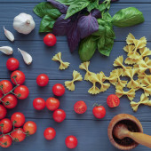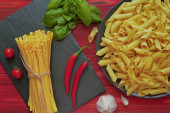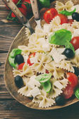 Makaron farfalle i bazylia na talerzu stojącym na czarnym tle
