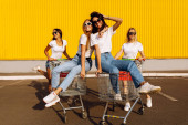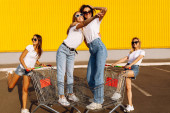 Piękny stylowy szczęśliwy młode kobiety w ubraniu casual, przyjaciele zabawy i jazdy w wózku sklepowym, na tle