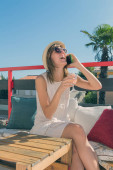 Młoda biała kobieta siedzi na patio i pije kawę / herbatę w sezonie letnim.