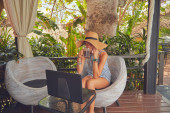 Zdjęcie "Młoda biała kobieta siedzi na patio i pije kawę / herbatę w sezonie letnim." może być wykorzystywane do celów osobistych i komercyjnych zgodnie z warunkami zakupionej licencji Royalty-free. Obraz jest dostępny do pobrania w jakości wysokiej rozdzielczości do 5760x3840.