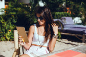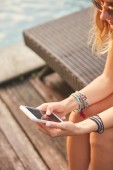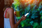 Biała kobieta korzystająca z telefonu komórkowego na pacji ogrodowej latem.