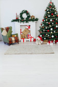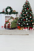 Choinka sosna z kominkiem wnętrza domu nowy rok dekoracji girlanda prezenty