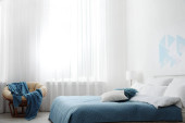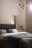 Zdjęcie "Komfortowa sypialnia z obrazem na dekoracyjnej ścianie. Projekt wnętrza" może być wykorzystywane do celów osobistych i komercyjnych zgodnie z warunkami zakupionej licencji Royalty-free. Obraz jest dostępny do pobrania w jakości wysokiej rozdzielczości do 5760x3840.