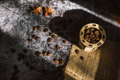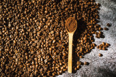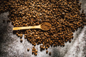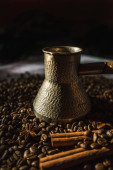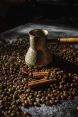 świeże aromatyczne palone ziarna kawy z przyprawami, kawa w antycznych daniach