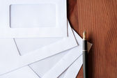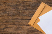 Kolorowe koperty papierowe na drewnianym stole, widok z góry. Miejsce na tekst