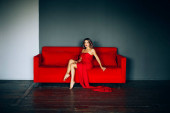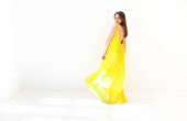 piękne blond kobieta długo żółty sukienka na zewnątrz