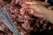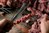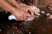 Rzeźnik tnący surowe płuco lub podroby z krów i kóz na drewnianej desce do siekania nożem.
