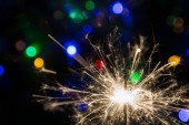 Sparkler na świątecznym tle bokeh. Świąteczna kartka okolicznościowa na Nowy Rok i Boże Narodzenie 2021, kolorowe światła w tle.