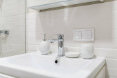 Ceramiczny zlewozmywak z kranem z mydłem i dozownikami szamponów w drogiej łazience na poddaszu lub kuchni