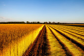 pola lniane podczas zbiorów w sierpniu w pobliżu miasta Etretat, Normandia, Francja