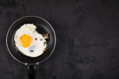 Robię angielskie śniadanie. gotowanie jajecznicy. dwa rozbite jajka na patelni na kuchence. dwa jajka są smażone na patelni. widok z góry. kuchenka, stół i patelnia. naczynia kuchenne.