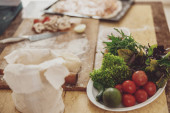 Piękny smily przystojny kobieta jest przygotowanie smaczne świeże włoskie pizze z warzywami w jej kuchni w domu