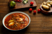 Zdjęcie "Zupa ziemniaczana z krewetkami i wapnem w jasnym talerzu obok imbiru, dziesięciocentówki i grzybów." może być wykorzystywane do celów osobistych i komercyjnych zgodnie z warunkami zakupionej licencji Royalty-free. Obraz jest dostępny do pobrania w jakości wysokiej rozdzielczości do 5760x3840.