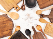 Widok z góry na drewniane sztućce naczynia kuchenne na białym drewnianym tle, płaskie leżaki