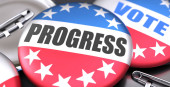Rewolta i wybory amerykańskie, symbolizowane jako urna do głosowania z flagą amerykańską w tle i frazą Rewolta na karcie do głosowania, aby pokazać, że rewolta jest związana z wyborami, ilustracja 3D