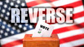 Przywrócenie i głosowanie w USA, na zdjęciu urna do głosowania z flagą amerykańską w tle i frazą Przywracanie symbolizującą, że Przywracanie jest związane z wyborami, ilustracja 3D