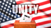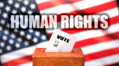 Ludzkość i głosowanie w USA, na zdjęciu urna do głosowania z amerykańską flagą w tle i wyrażenie Ludzkość symbolizujące, że ludzkość jest związana z wyborami, ilustracja 3D