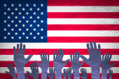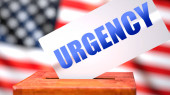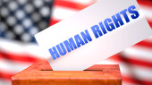 Ludzkość i wybory amerykańskie, symbolizowane jako urna do głosowania z flagą amerykańską w tle i frazą Ludzkość na karcie do głosowania, aby pokazać, że ludzkość jest związana z wyborami, ilustracja 3D