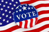 Odwaga i głosowanie w USA, na zdjęciu urna do głosowania z flagą amerykańską w tle i frazą Odwaga symbolizująca, że odwaga jest związana z wyborami, ilustracja 3D