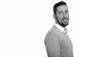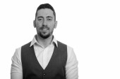 Portret młodego przystojnego brodatego mężczyzny na ulicach w czerni i bieli