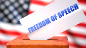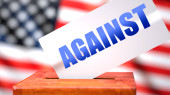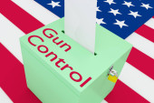 Prawa do broni i wybory amerykańskie, symbolizowane jako urna do głosowania z amerykańską flagą i frazą Prawa do broni na karcie do głosowania, aby pokazać, że prawa do broni są związane z wyborami, ilustracja 3D