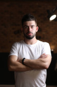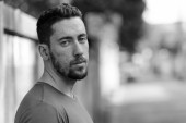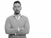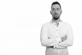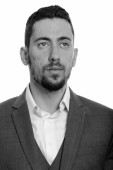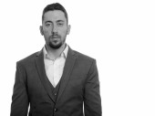 Portret młodego przystojnego brodatego mężczyzny na ulicach w czerni i bieli