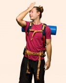 mężczyzna turysta z plecak wychował jego ramię