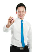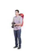 mannelijke wandelaar met rugzak met behulp van tablet pc
