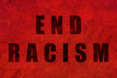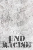 Koniec rasizmu i polityki w USA, symbolizowany jako osoba stojąca przed frazą Koniec rasizmu Koniec rasizmu jest związany z polityką i wyborem każdej osoby, ilustracja 3D