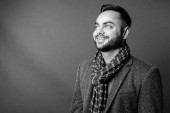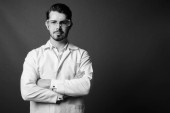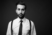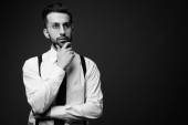 Portret młodego, przystojnego brodatego biznesmena z widokiem na miasto w czerni i bieli