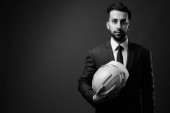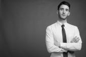 Portret młodego, przystojnego, brodatego biznesmena w garniturze z widokiem na miasto w czerni i bieli