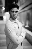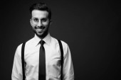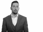 Portret młodego, przystojnego, brodatego biznesmena w garniturze z widokiem na miasto w czerni i bieli