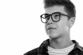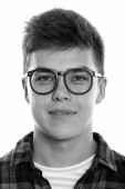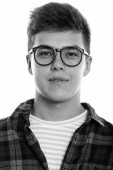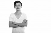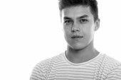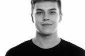 Studio strzał młody przystojny mężczyzna odizolowany na białym tle w czerni i bieli