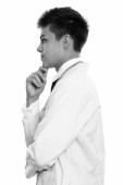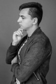 Studio zdjęcia młodego przystojnego biznesmena w garniturze izolowane na białym tle w czerni i bieli
