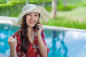 Close up - Piękna azjatycka kobieta podróżnik nosić kapelusz krem krem krem do opalania balsam w basenie.