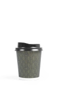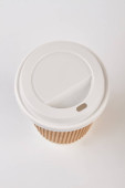 Brązowy kubek z papieru falistego z czarnym wieczkiem do zabrania gorących napojów w kawiarni. Kawa iść z naturalnym cieniem na białym tle odizolowany widok z góry. Koncepcja stylu życia leżała płasko. Marka makieta.