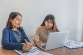 Zdjęcie "Dwie azjatyckie kobiety biznesu pracujące razem patrząc na laptopa." może być wykorzystywane do celów osobistych i komercyjnych zgodnie z warunkami zakupionej licencji Royalty-free. Obraz jest dostępny do pobrania w jakości wysokiej rozdzielczości do 5760x3840.