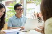 Widok z boku - dwie azjatyckie biznesmenki rozmawiające z klientem w sali konferencyjnej.
