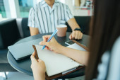 Zdjęcie "Widok z boku - dwie azjatyckie biznesmenki rozmawiające z klientem w sali konferencyjnej." może być wykorzystywane do celów osobistych i komercyjnych zgodnie z warunkami zakupionej licencji Royalty-free. Obraz jest dostępny do pobrania w jakości wysokiej rozdzielczości do 5760x3840.