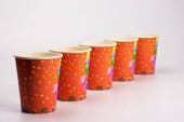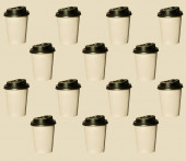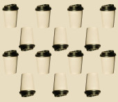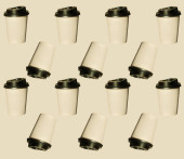 Kawa iść regularny wzór z naturalnych cieni na białym tle widok z góry. Brązowe papierowe kubki z wieczkami do zabrania gorących napojów w kawiarni. Koncepcja stylu życia płaska tapeta lay Desktop.