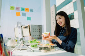 Azji biznes kobieta noszenie okulary korzystać lunch box zestaw w biurze.