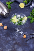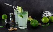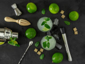 Widok z góry orzeźwiający koktajl miętowy mojito z rumem i limonką, napój zimny z barmanem akcesoria