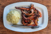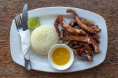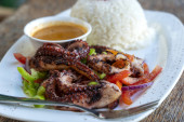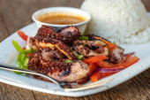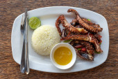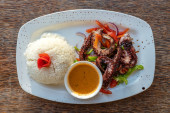 Smażone macki ośmiornicowe z białym ryżem na talerzu w restauracji, wyspa Zanzibar, Tanzania, Afryka, zbliżenie.