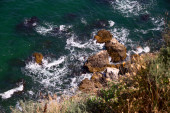 Ptaki na ogromnych skałach, graniczące z Morzem Śródziemnym z przezroczystymi wodami