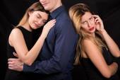 Zdjęcie "jeden mężczyzn i dwie kobiety. niekonwencjonalne związek kochanków. był miłośnikiem jej męża. trójkąt miłosny." może być wykorzystywane do celów osobistych i komercyjnych zgodnie z warunkami zakupionej licencji Royalty-free. Obraz jest dostępny do pobrania w jakości wysokiej rozdzielczości do 5760x3840.