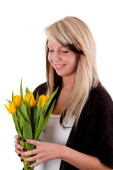 piękna młoda kobieta z czerwony kwiat, na białym tle