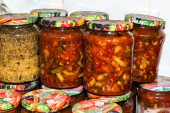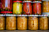 Owoce i warzywa puszkowane w szklanych słoikach. Dżem jabłkowy. Marynowane warzywa. Ochrona zbiorów na zimę. Marynować w szklanym słoiku. Przepis. Kuchnia. Menu. Sól jedzenia. Przygotowanie żywności.