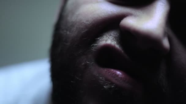 Niezwykły portret brodatego mężczyzny z krótkimi brązowymi włosami. Dorosły mężczyzna z brodą wtyka nos w kamerę. Wyrazy twarzy i emocje.
