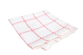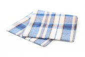 Checkered ręcznik kuchenny izolowany na białym.Szary niebieski i biały sprawdzone serwetkę.Gingham tkaniny.