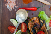 piec opalany drewnem gotowane piersi kurczaka na desce z ziół przypraw i warzyw